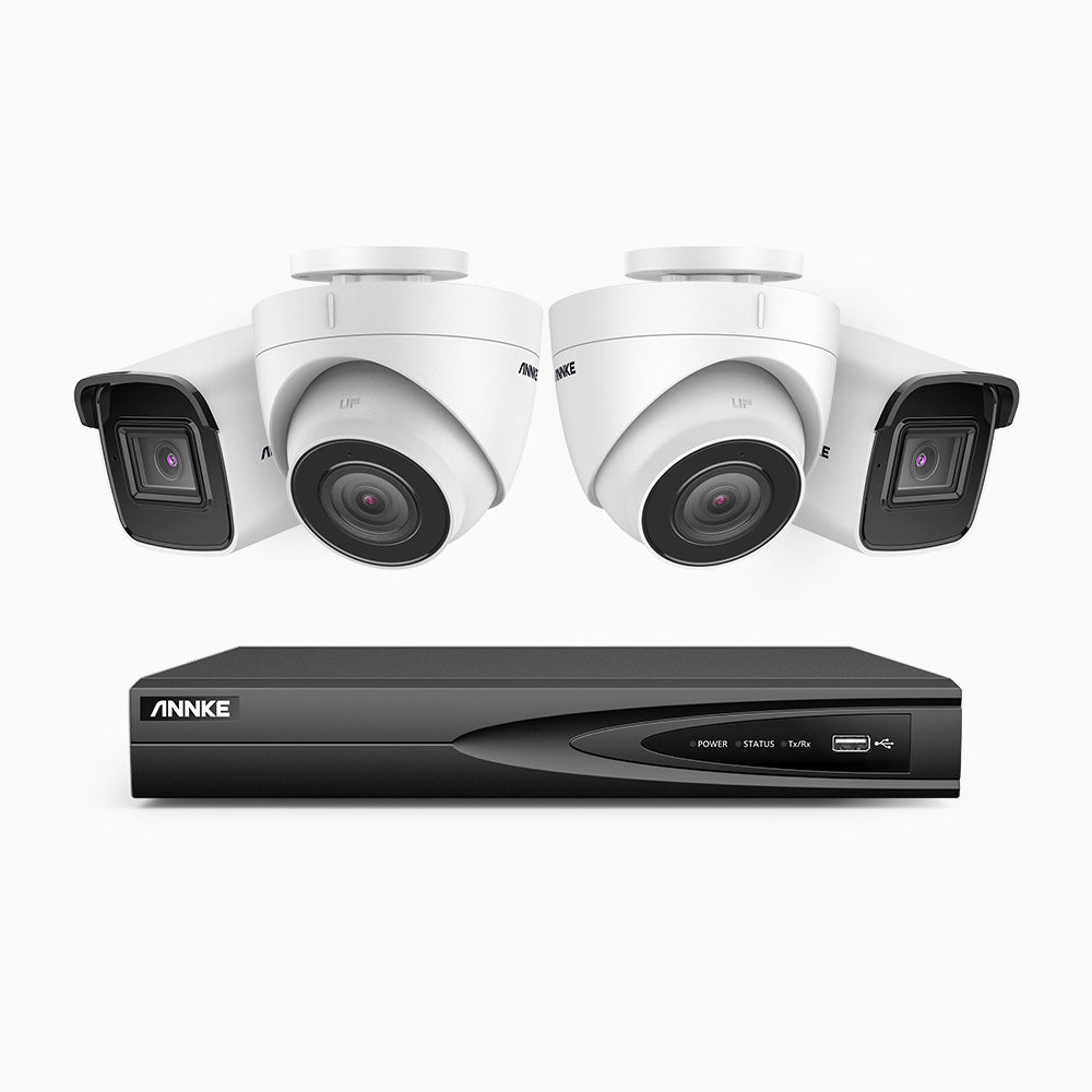 H800 - Kit de vigilancia PoE 4K con 2 cámara bullet y 2 cámara domo y videograbador NVR de 4 canales, Visión nocturna a color e infrarrojos, detección de humanos y vehículos, micrófono integrado, ángulo de visión 96º