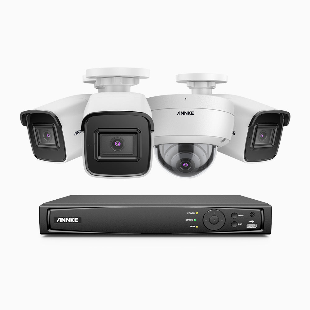 H800 - Kit de vigilancia PoE 4K con 3 cámaras bullet y 1 cámaras domo (antivándalica IK10) y videograbador NVR de 8 canales, Visión nocturna a color e infrarrojos, detección de humanos y vehículos, micrófono integrado, ángulo de visión 96º