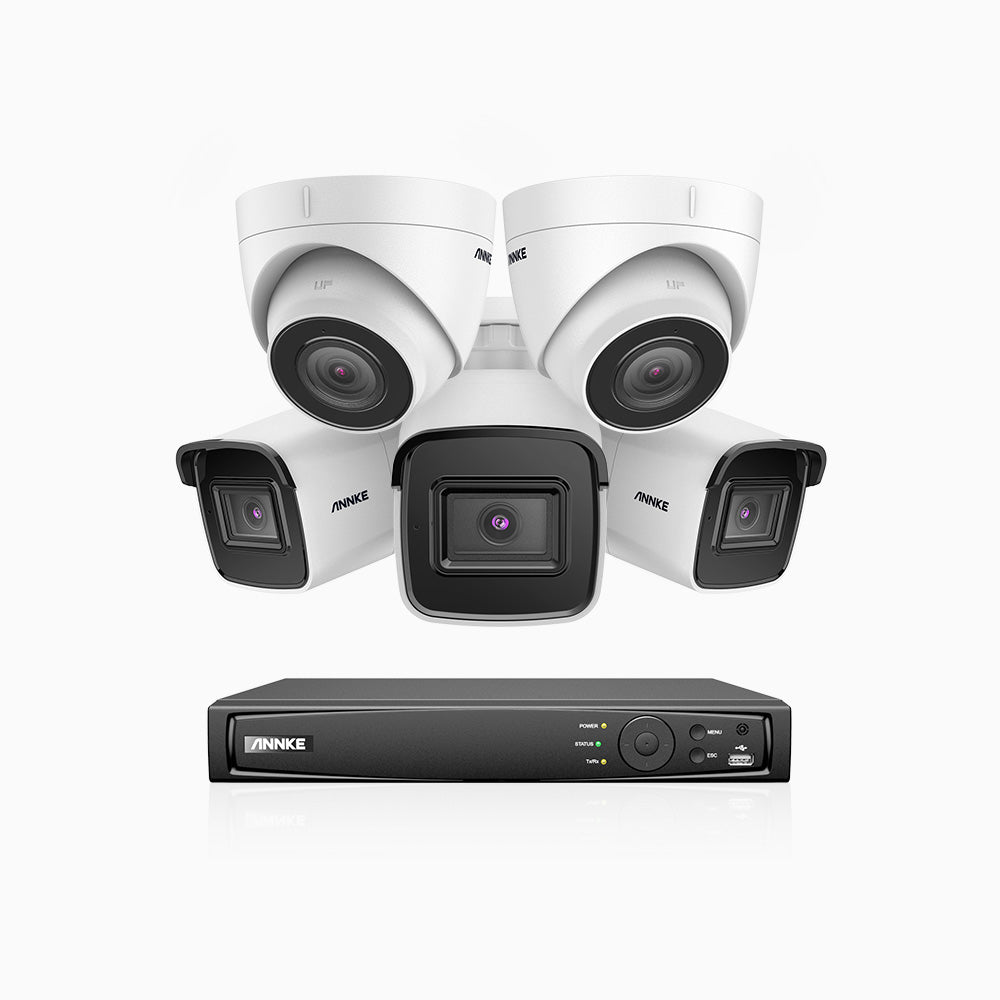H800 - Kit de vigilancia PoE 4K con 3 cámaras bullet y 2 cámaras domo y videograbador NVR de 8 canales, Visión nocturna a color e infrarrojos, detección de humanos y vehículos, micrófono integrado, ángulo de visión 96º